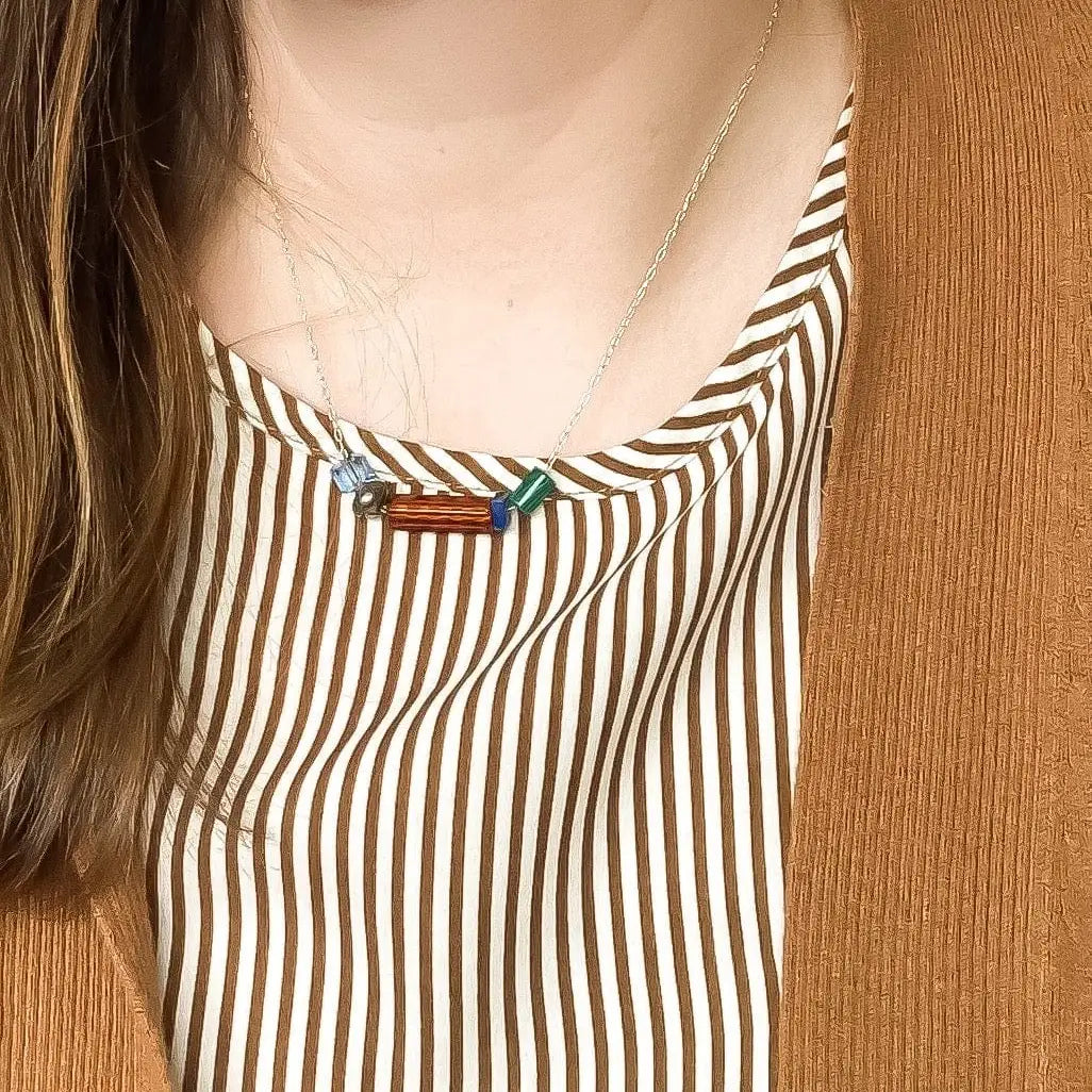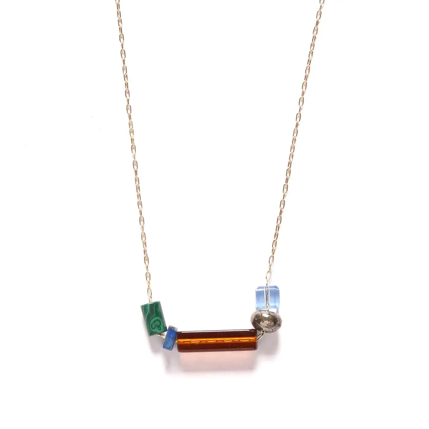 Thin 14kt gold filled chain with a playful mix of beads- Malachite, Lapis, Pyrite, vintage dark amber and light blue glass. Beads are able to slide freely on the chain.
