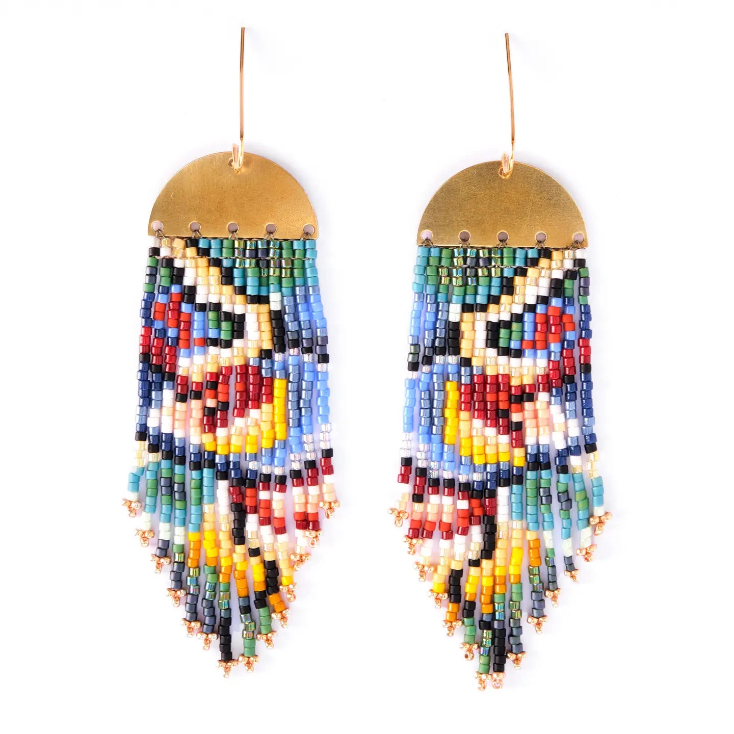 These fringe earrings are full of flowing movement with curved line patterns that weave in and out of each other and colors that ebb and flow. Each mesmerizing earring has Japanese Miyuki glass bead colors in them giving the pattern depth and dimension. The hand strung fringe is attached to a gorgeous brass half-moon earring component.