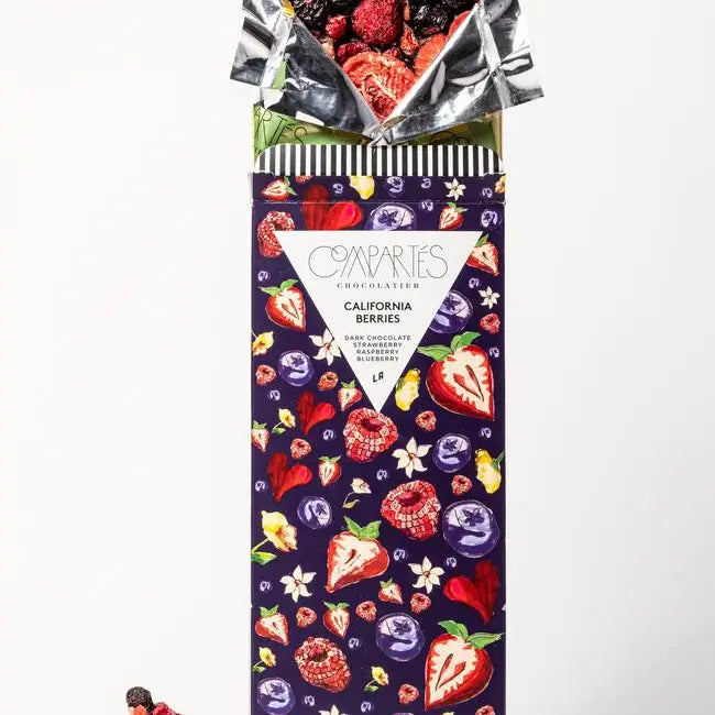 CALIFORNIA BERRIES bar dark chocolate bar brings you the taste of spring with every bite. A deep dark chocolate studded with all natural dried strawberries, raspberries and blueberries. The most beautiful berry bar you'll ever see... and eat! Handmade in Los Angeles chocolate kitchens.