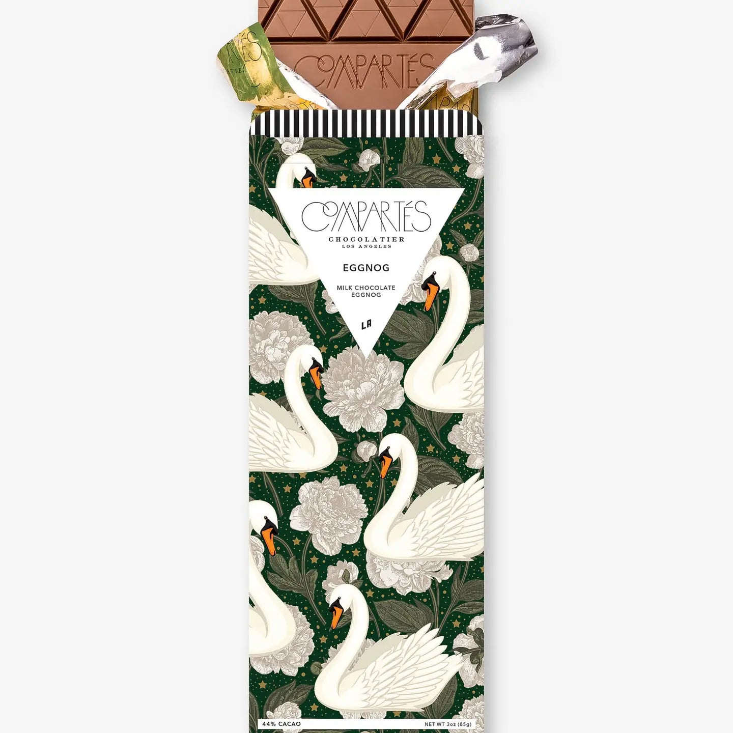 EGGNOG infused chocolate bar is a winter classic delight elevated to gourmet status in chocolate! Delicious homemade eggnog is laced and infused throughout the silky milk chocolate. Featuring sophisticated and ultra luxe packaging, this new eggnog bar with swan lake motif is a festive holiday gift and treat.