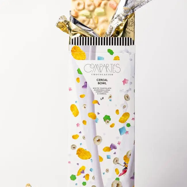 CEREAL BAR Gourmet white chocolate bar is a cereal lover's dream. Creamy Compartés white chocolate overflowing with crunchy cereal and sweet marshmallows. Handmade in Los Angeles.