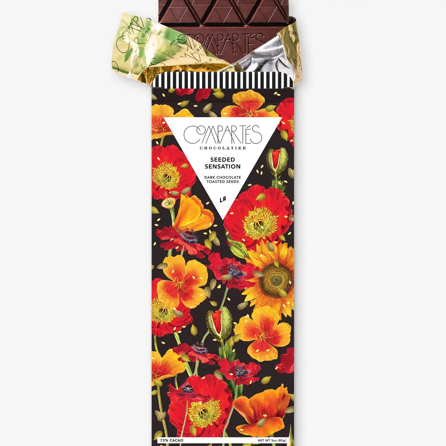 SEEDED SENSATION This delicious creation has gorgeous California poppies and California Sunflowers designs coupled with crunchy toasted pumpkin seeds, sunflower seeds and sesame seeds on a bed of deep dark chocolate (its vegan too).
