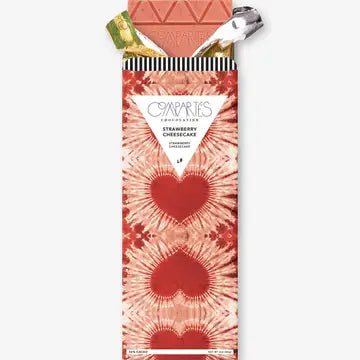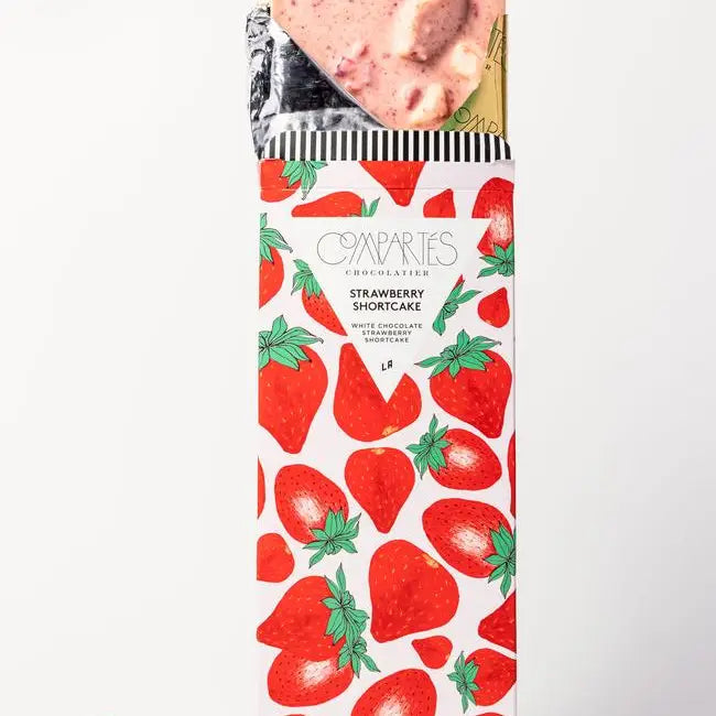 STRAWBERRY SHORTCAKE white chocolate bar, is packed full of strawberries and chunks of airy homemade shortcake. It's a chocolate bar that tastes like absolute heaven in every bite! Wrapped up in Compartés hand-drawn strawberry graphics. Handmade in Los Angeles chocolate kitchens.