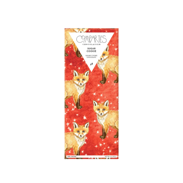 SUGAR COOKIE Smooth, creamy milk chocolate adorned with the best Homemade Sugar cookies inside -- just how Grandma made them. Crystallized sugar embedded into the bar makes this a sweet treat you'll never want to finish. Sweet, creamy, and tasty -- This delightful holiday treat is sure to bring you back for more! Featuring a beautiful festive pattern of foxes hand-drawn by Artist and head Chocolatier, Jonathan Grahm.