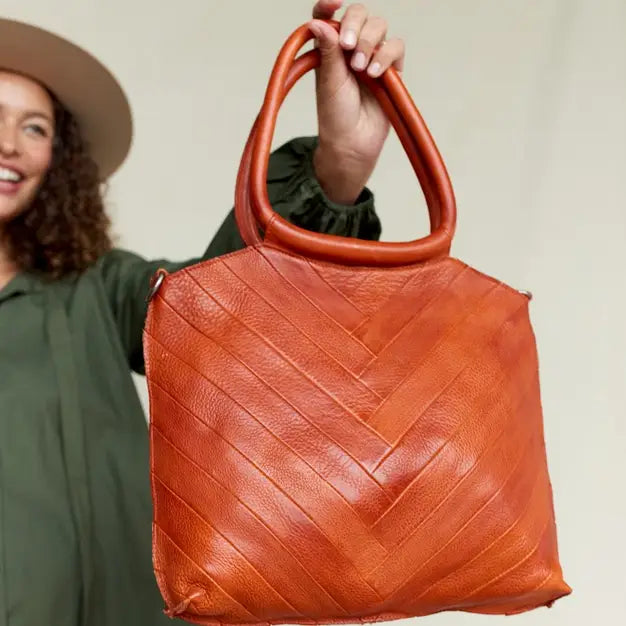 Recessed top metal zip entry with leather pull, Exterior front features stitched v pattern, Exterior back features hidden zip pocket.