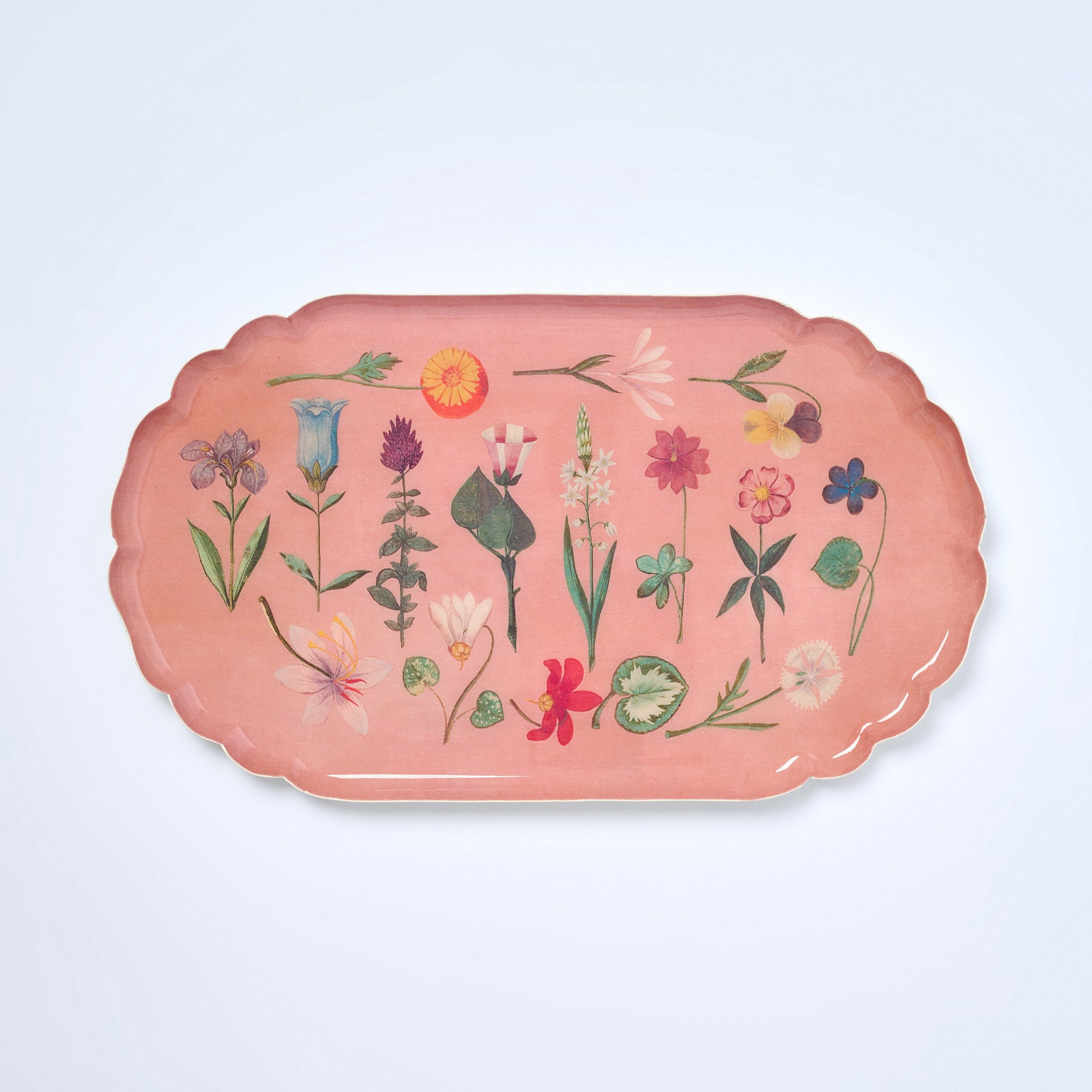 Green Festival of Flowers: The delightful oval shaped tray features remarkable watercolor illustrations of flowers, hand-painted by an unknown artist in the early 1600s, onto the pages of a 1596 book dedicated to the Christening of Lady Elisabeth of Hesse. H 4.7" x W 9.8" x D 0.6"