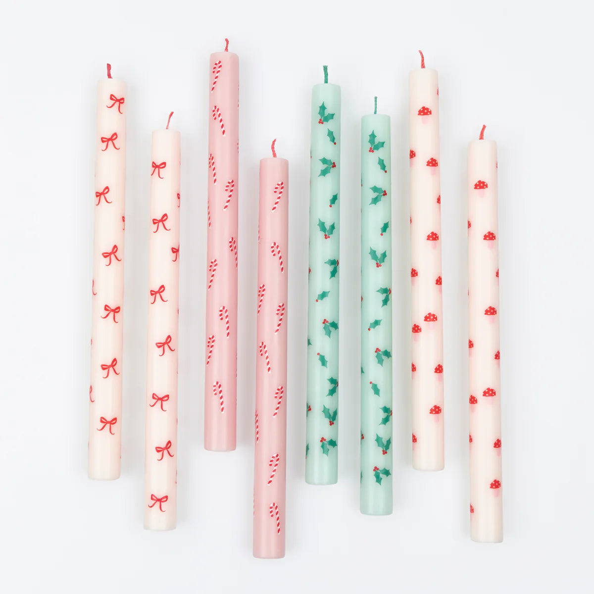 It's Christmas candle time! Enhance your seasonal decor with this stylish set of eight festive table candles, featuring a mix of timeless yet contemporary patterns and colors. The striking red and green wicks add a special touch, to create a warm, inviting glow. Perfect for your dinner table or mantel as a statement centerpiece, or display throughout your home. Beautifully packaged in a printed patterned keepsake box, they also make an elegant host gift or thoughtful present for someone who adores eye-catching candles.