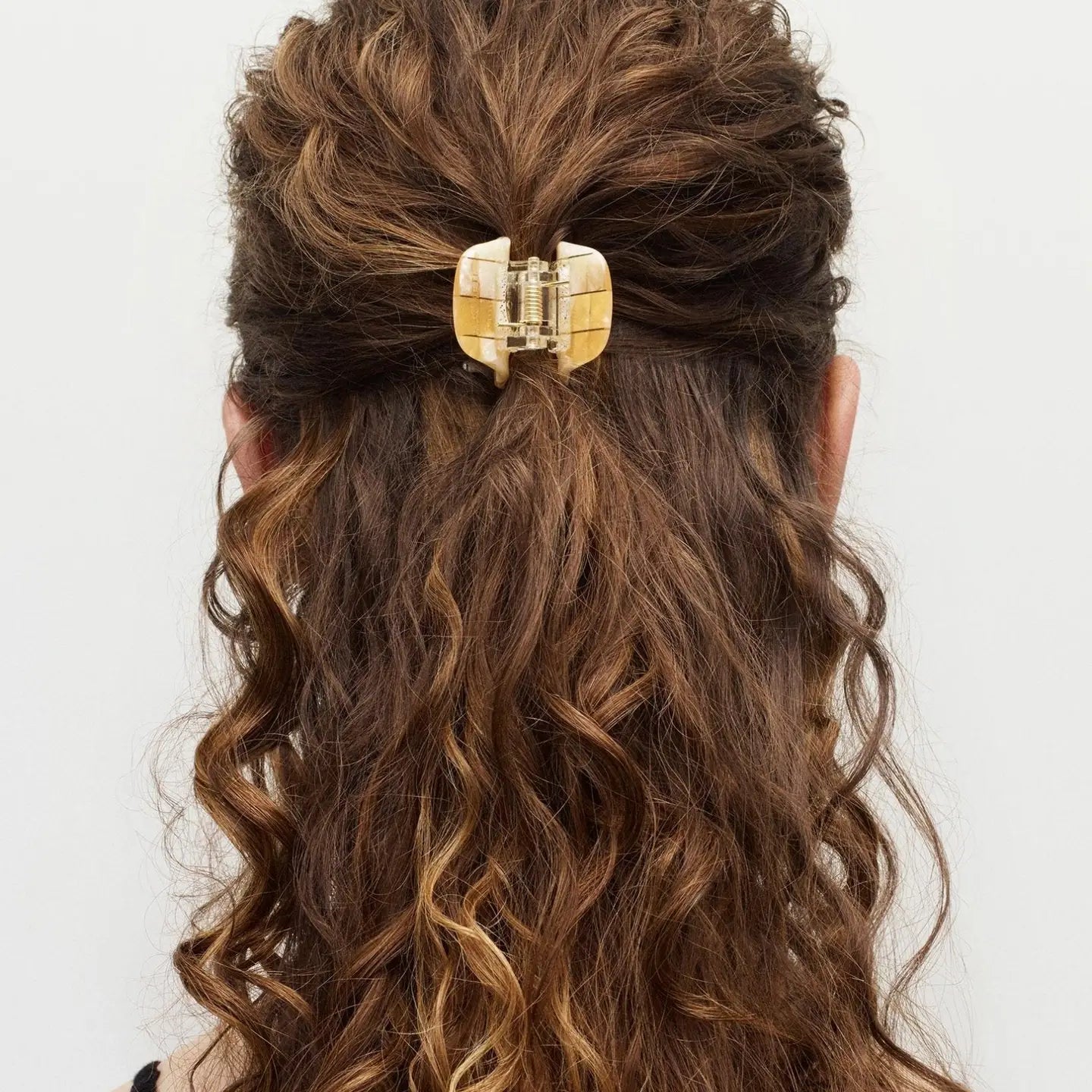 A handcrafted mini claw clip designed to securely and gently hold hair, made from Italian bio-acetate. Recommended for all hair types and textures.