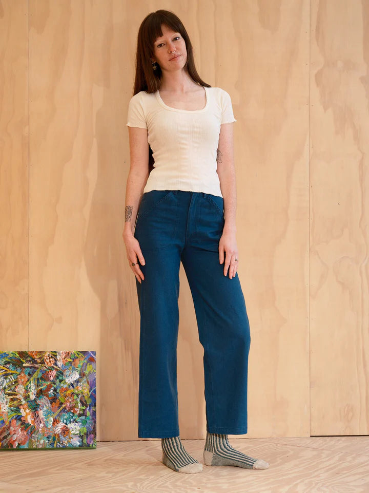Come and get your perfect pants! Painter Pants have high-waisted silhouette with elastic in the back for comfort, a snug bottom with room for your curves, and full straight legs that are slightly cropped.