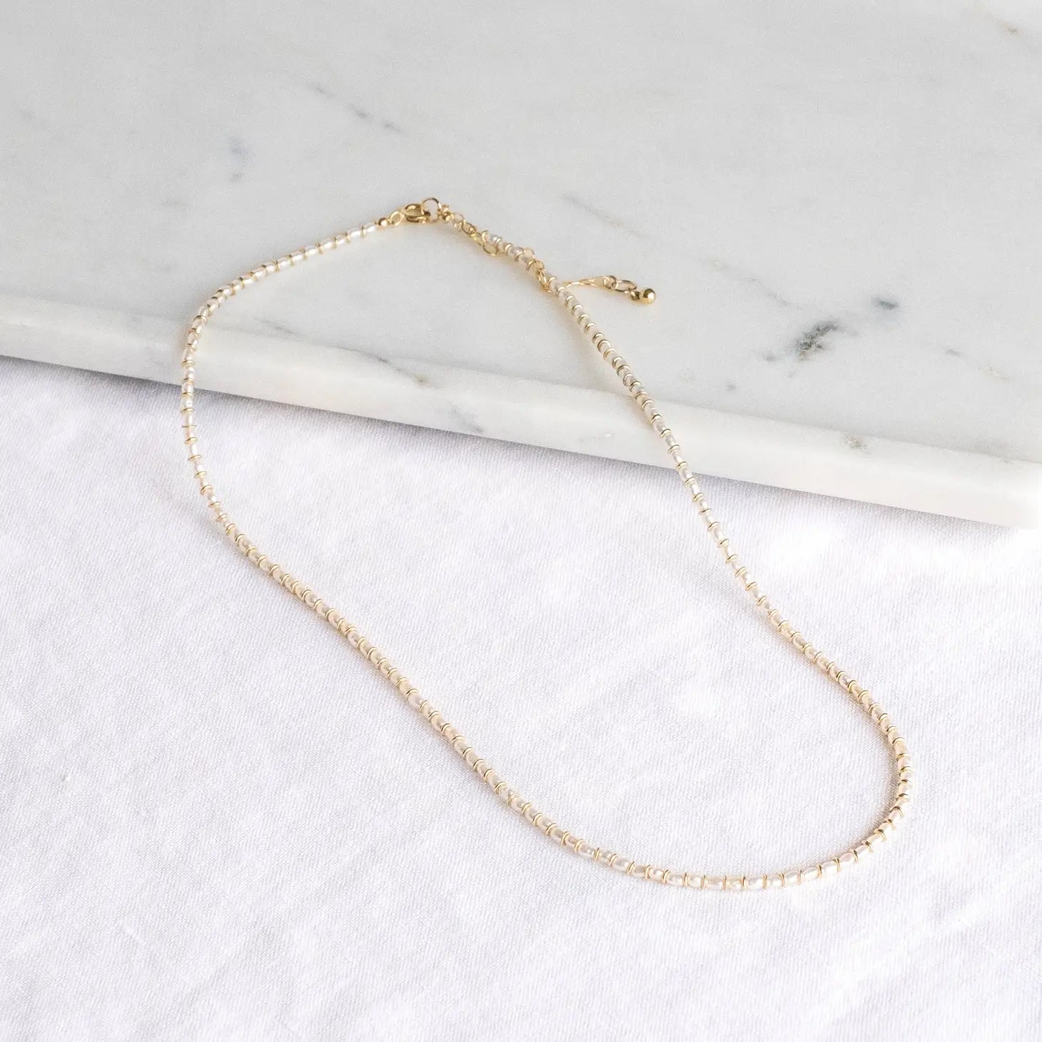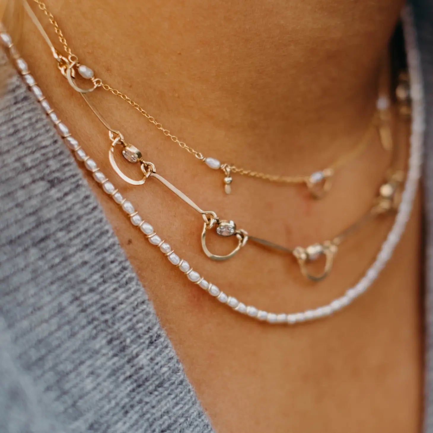 Pearl Three is a layering of tiny fresh water pearls and gold filled spacer disk beads.