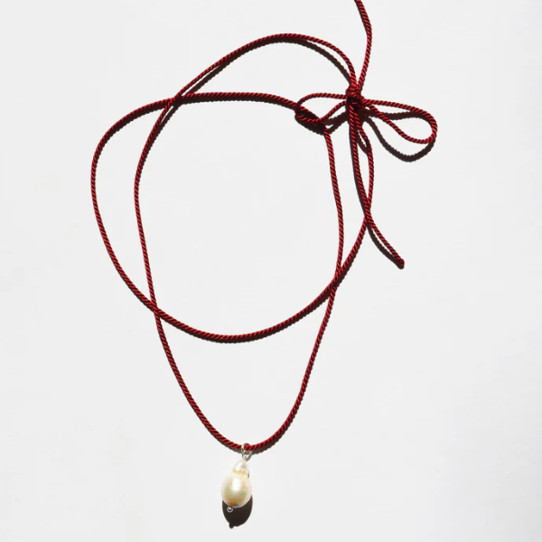 Rope necklace with baroque pearl dangle. Double up this tie necklace to leave the bow in the front or back.