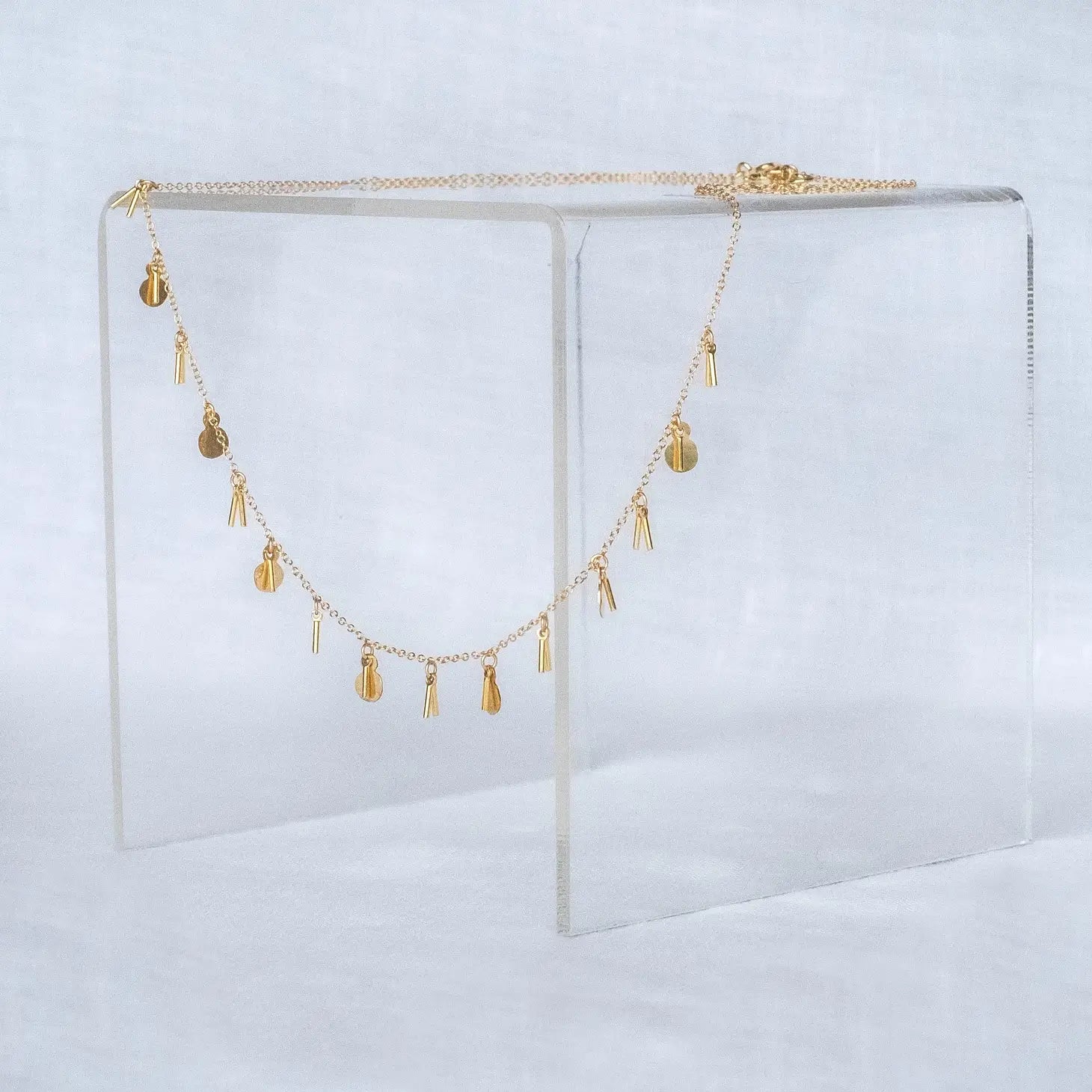 Simple and sparkling. This necklace has beautiful gold fill fringe and sequins swinging and swaying.