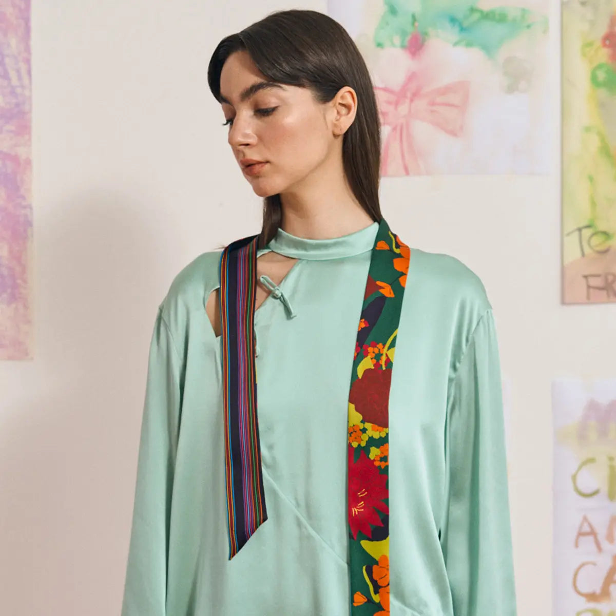 Crafted from high-quality silk satin, this scarf features a stunning design that showcases vibrant flowers that were so beloved by Frida. The intricate details and rich colors of the design make this scarf a true work of art. This silk skinny scarf is perfect for wearing in a variety of ways. It can be tied around the neck for a chic and sophisticated look, or worn as a headband or hair accessory to add a pop of color to any outfit.
