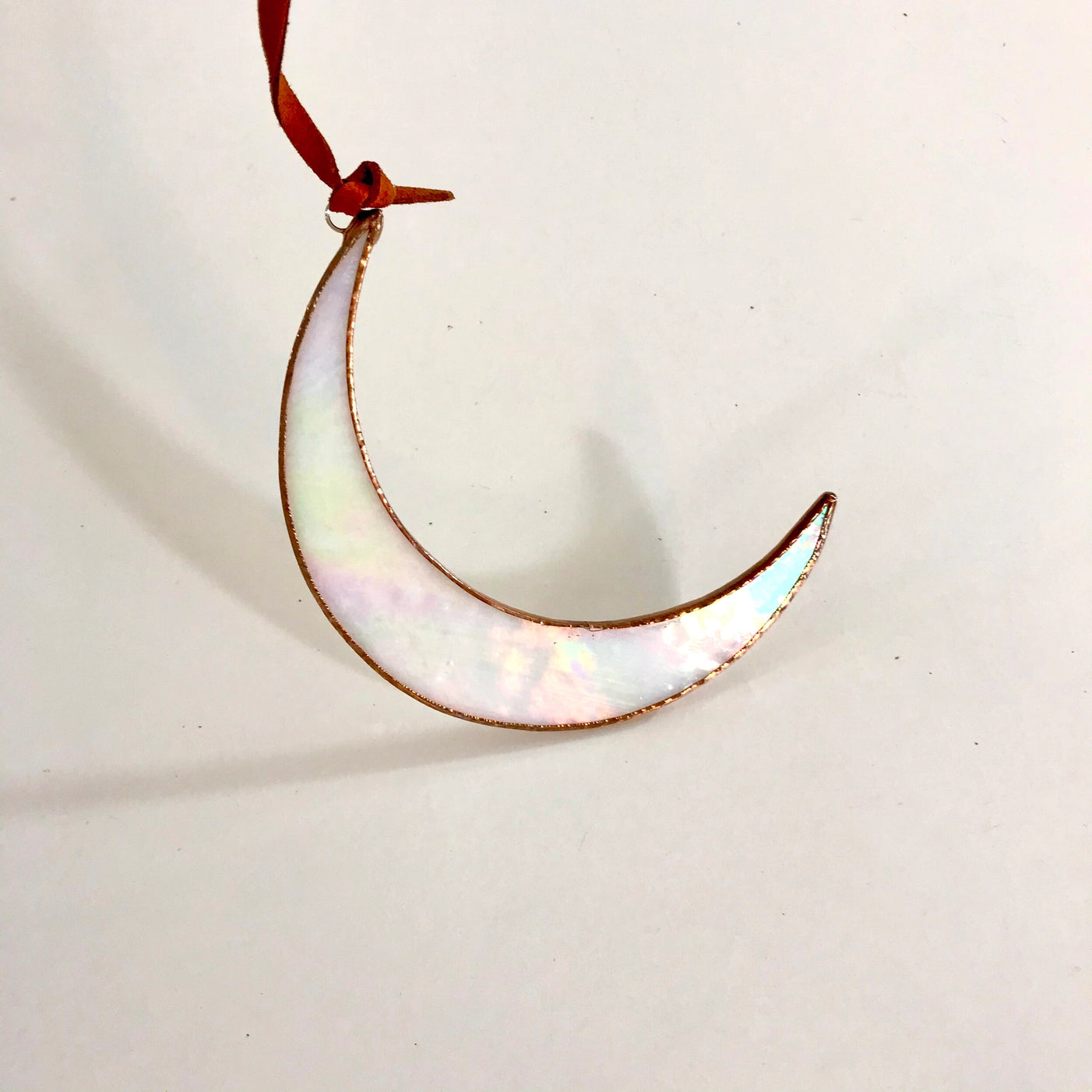 These luminous white iridescent moon radiates a soft, magical glow. Handcrafted with shimmering glass, it captures the quiet beauty of a full moon. Elegant and ethereal, it’s a captivating piece that brings a dreamy, celestial touch to any space—perfect for moon lovers and stargazers alike.