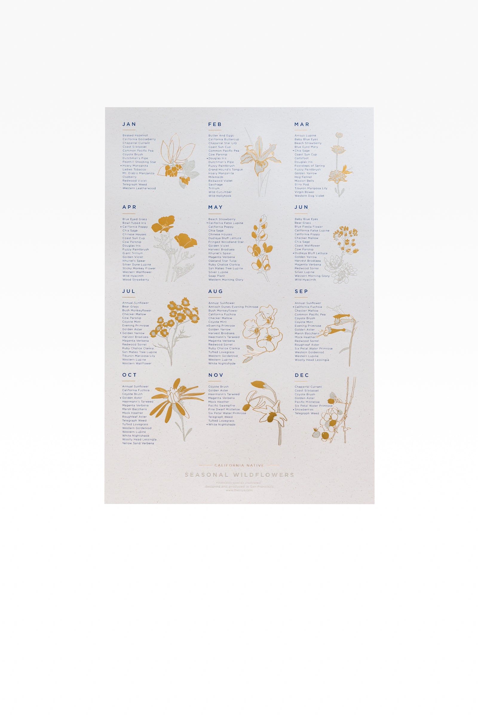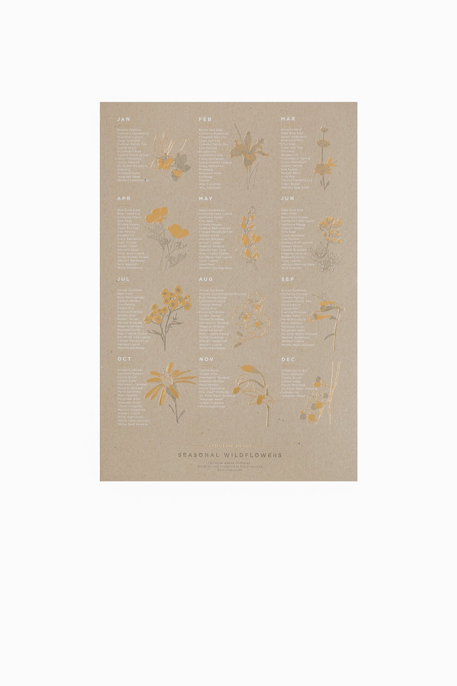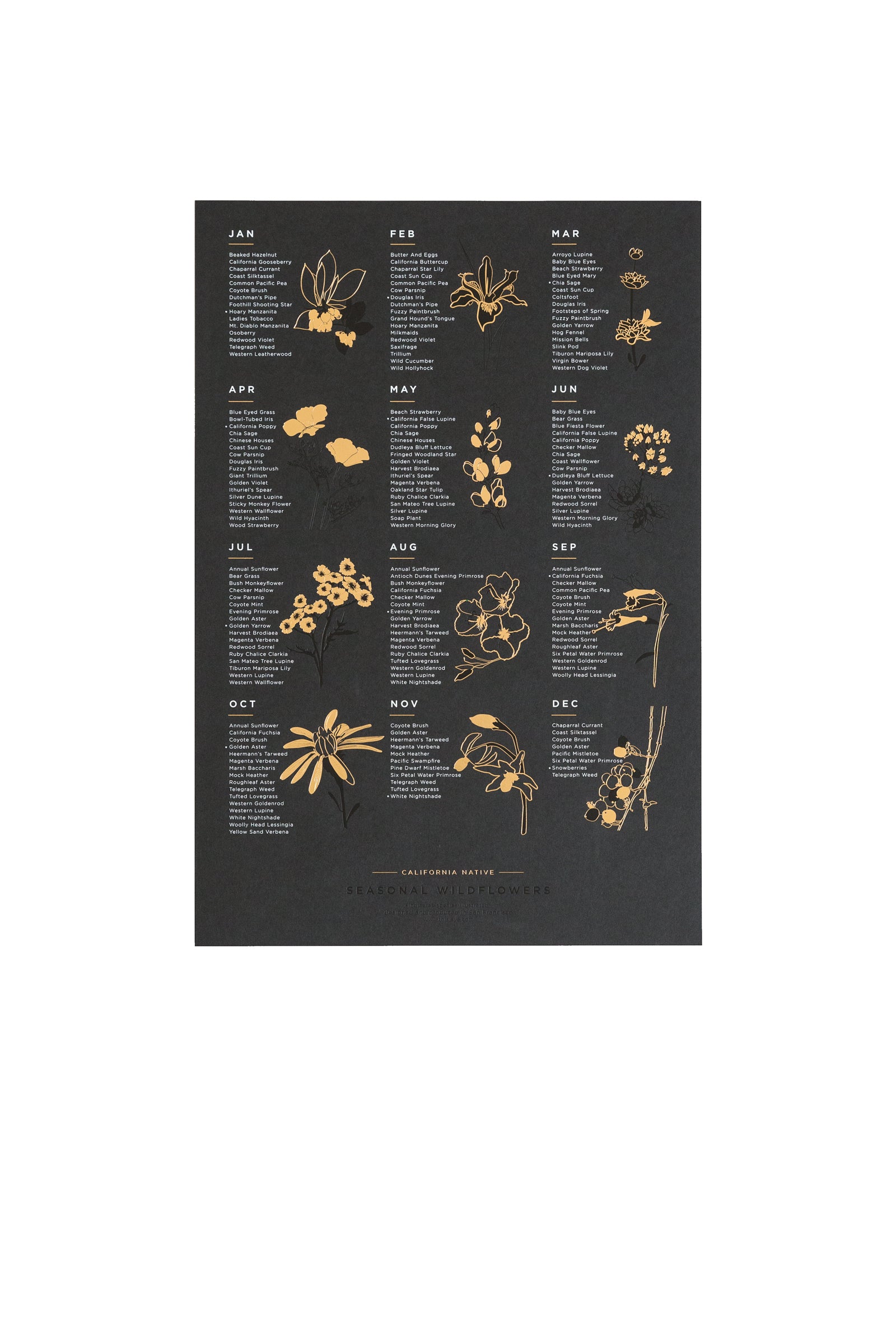The California Native Wildflower Poster features 150 native species as they bloom each month. The poster features both prolific, common and rare species that are native specifically to the Central Coast / Bay Area. Approximate radius of the listed species is centered on San Francisco, extending North through Marin County, South through Santa Cruz County and Diablo Mountain as the eastern border. Many of these species are found up and down the length of the west coast.